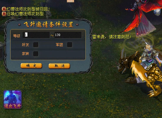 1、飞升挑战者可以通过点击屏幕右边的“飞升挑战”按钮而进入比亚卫城开始飞升挑战,而挑战者的盟友则可以通过屏幕中央出现的受邀请对话框进入比亚卫城协助飞升挑战者。挑战者只有60分钟时间来通过全部的难关,期间可以在屏幕的右边看到时间提示。超时或者死亡都会导致任务失败,只能等到第二天再重新挑战。