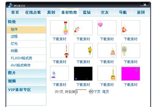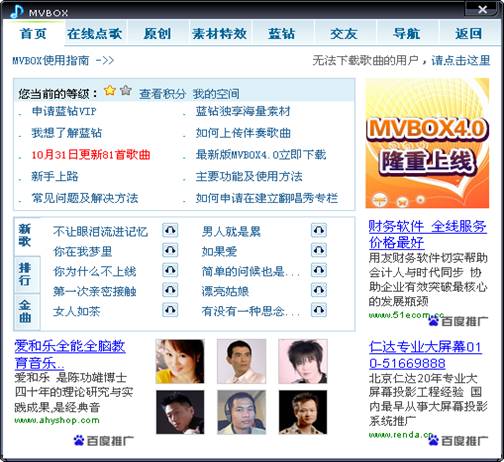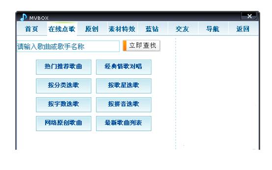 点歌台是方便用户点播歌曲、下载特效素材的地方;MVBOX具有超大曲库,用户通过点歌台可以搜索到平台内所有的流行歌曲和最新网络歌曲,每首歌都具有左右声道和同步歌词字幕,是您K歌的最好选择,同时点歌台备有海量视频、图片、大头贴特效等多种素材下载,方便用户使用各种素材制作自己的MTV和美化您的摄像头;点歌台的原创频道,汇集众多名家歌手,音乐人、翻唱秀、舞蹈秀等,成就您明星之梦。