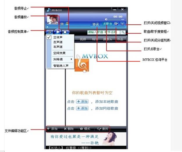 (1) 音频播放控制面板:控制歌曲播放的音量大小,播放停止,左右声道、升降调选择,歌曲/歌手搜索,点歌台进入按钮,以及注册用户个人空间形象照和进入个人空间按钮。