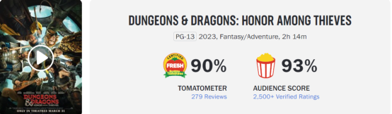 从前作的失败中我们也能发现,电影与游戏的视域是不同的,即使在游戏领域,桌游跑团玩家与CRPG玩家的体验也大不相同。这次的《龙与地下城:侠盗荣耀》有点依靠前辈与同行衬托,依托其热诚的创作态度,为好莱坞和游改电影的口碑扳回一局。