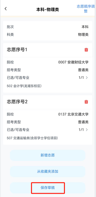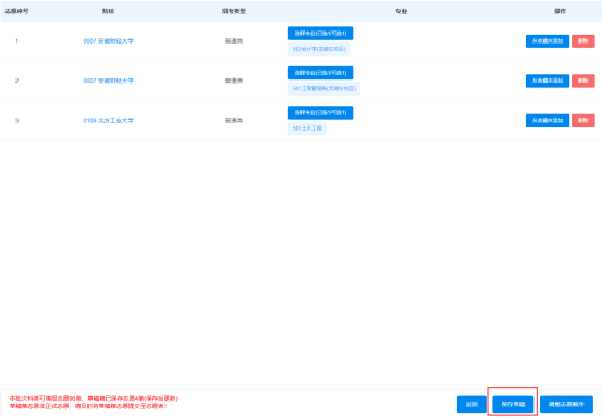 考生志愿草稿编辑完成后点击“保存草稿”按钮进行保存,否则志愿草稿将不能保存。