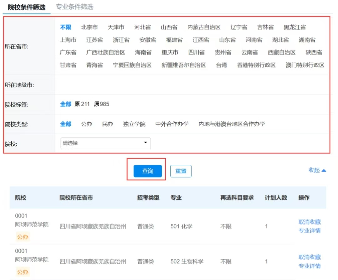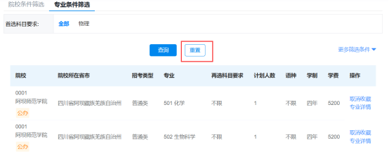 需要注意,如果先筛选查询了院校,再进行专业条件筛选时,筛选结果为前面筛选院校的相关专业,可以点击“重置”清空查询条件。