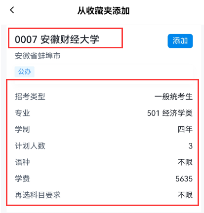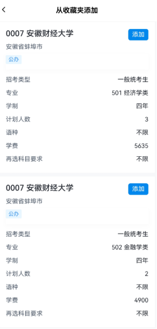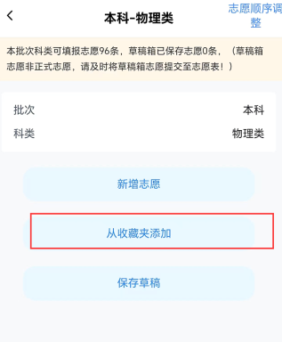 也可以点击“从收藏夹添加”按钮,将已经收藏的院校专业导入某个志愿。