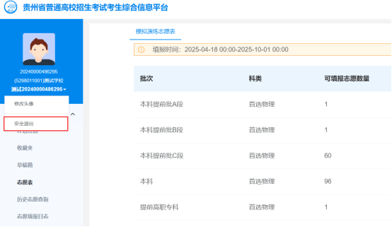 考生志愿填报完成后,点击“安全退出”以及关闭填报页面,以确保志愿信息安全。