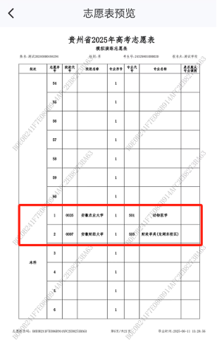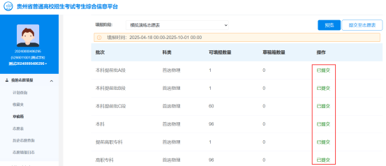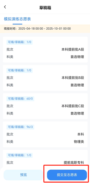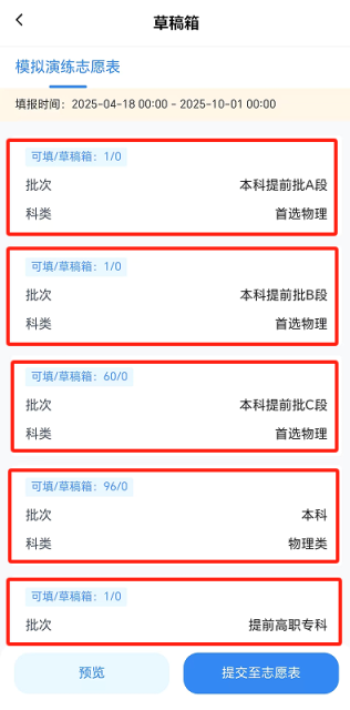 考生保存志愿草稿后,在“草稿箱”中向左滑动批次区域,点击“预览”按钮核对志愿草稿。在正式提交志愿前,可对志愿草稿进行修改。务必逐条核对志愿信息,包括核对院校代号、院校名称、专业代号、专业名称以及志愿顺序等。