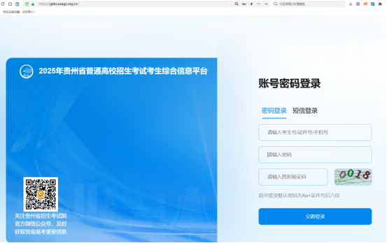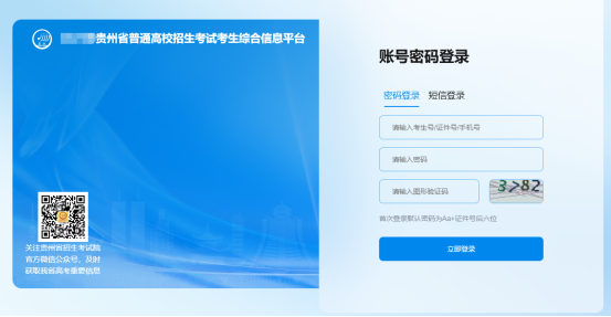 考生登录贵州省普通高校招生考试考生综合信息平台,按要求输入身份证号及密码登录系统。