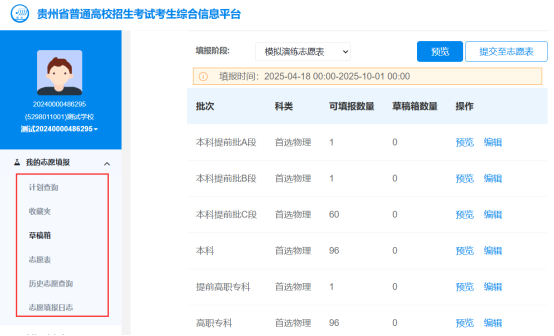 考生通过贵州省普通高校招生考试考生综合信息平台()或最新版本“贵州招考”移动端APP(可通过华为应用市场、苹果App Store或腾讯应用宝下载安装)模拟填报所有批次志愿,参考《贵州省2025年高考志愿填报操作指南》进行练习。
