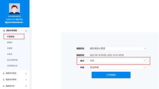 考生可在“计划查询”栏目选择对应“批次”查询本年度高考招生计划。