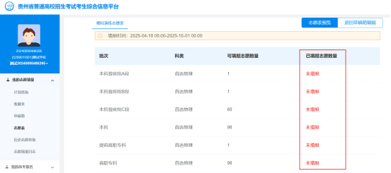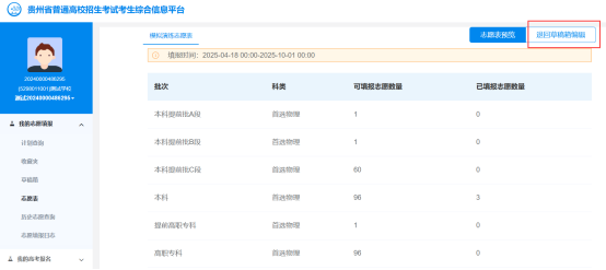 考生若需修改已提交志愿,可通过“志愿表”→“退回草稿箱编辑”,将已提交志愿退回至草稿箱。此时系统会要求输入登录密码,并提示已提交志愿表次数和剩余可提交次数。