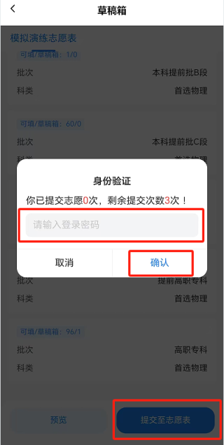 考生各批次志愿草稿编辑完成且核对无误后,点击草稿箱页面“提交至志愿表”按钮,输入“登录密码”后将“草稿箱”中志愿作为正式志愿提交,确保提交成功后志愿方可生效。未提交至志愿表或者提交失败,志愿将为无效志愿。
