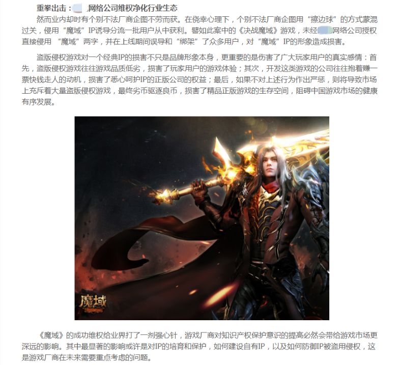 2018年1月,w公司在其经营的“魔域”游戏官方网站上发布一篇题为《IP维权风暴重拳维权胜诉 严打盗版零容忍》的文章,并附上了部分判决书内容的扫描图片作为文章配图。这篇文章被搜狐、腾讯、新浪、今日头条等多家网站转载,而且部分网站在转载时更改了文章标题,一定程度损害了J公司的商业信誉。