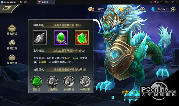 神兽分为青龙、白虎、朱雀、玄武四种神兽,携带后可作为阵容成员之一,前期用的比较多的神兽是青龙和玄武,资源和时间有限,首先培养一种神兽到80级,有充裕的坐骑可以消耗坐骑学习高等级神兽技能,高等级神兽技能在演武场上可以扭转乾坤。
