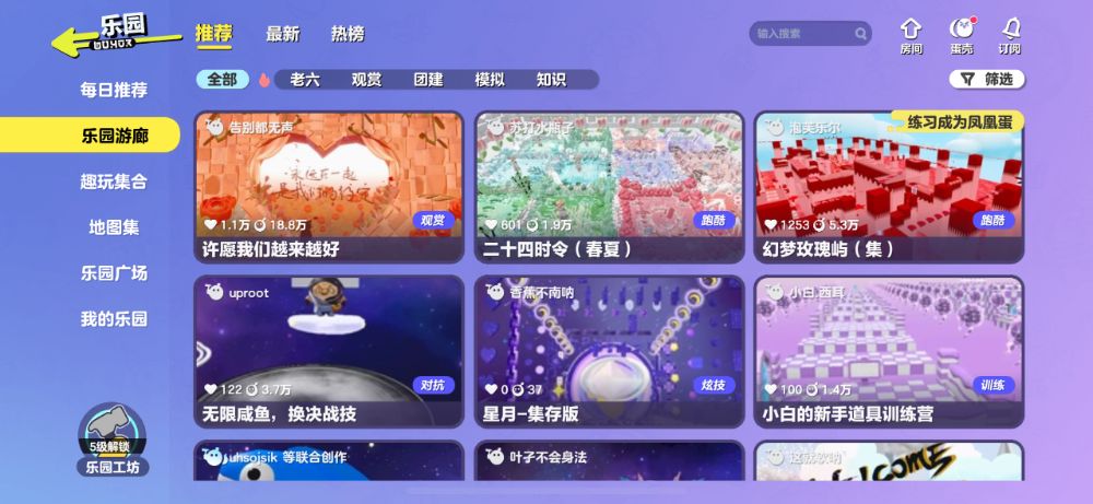 在开启“乐园健康防护”模式中的儿童模式后,游戏内UGC功能“乐园”中的页面将不会再进行个性化推荐,仅会推荐筛选过后的地图;在少年模式中,则会在个性化推荐的基础上对可能含有未成年不适的元素进行屏蔽防护。而研究员实测后发现,儿童模式/少年模式下的乐园页面中,确实对未成年人可见内容进行了一定程度筛选。