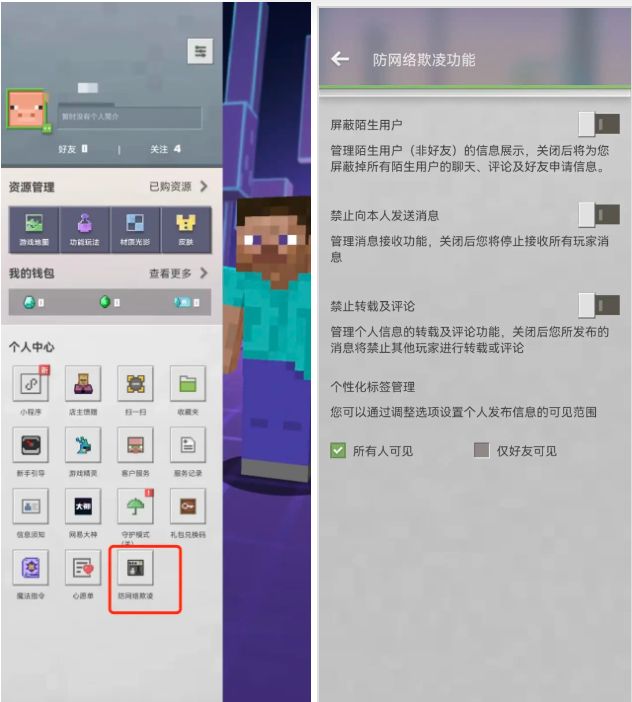 (图说:《我的世界》在个人中心下设置了专属的“防网络欺凌”功能。)