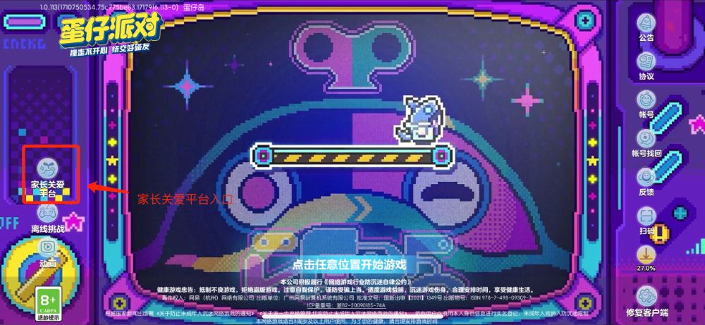 从本次测评结果来看,虽然多数游戏企业已有搭建家长管理平台的意识,但在游戏产品中给予的直接指引仍有待完善。如网易《蛋仔派对》,均在游戏登录界面给到了家长管理平台的明确打开路径。