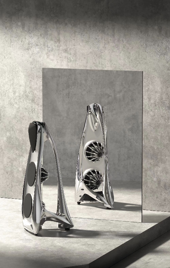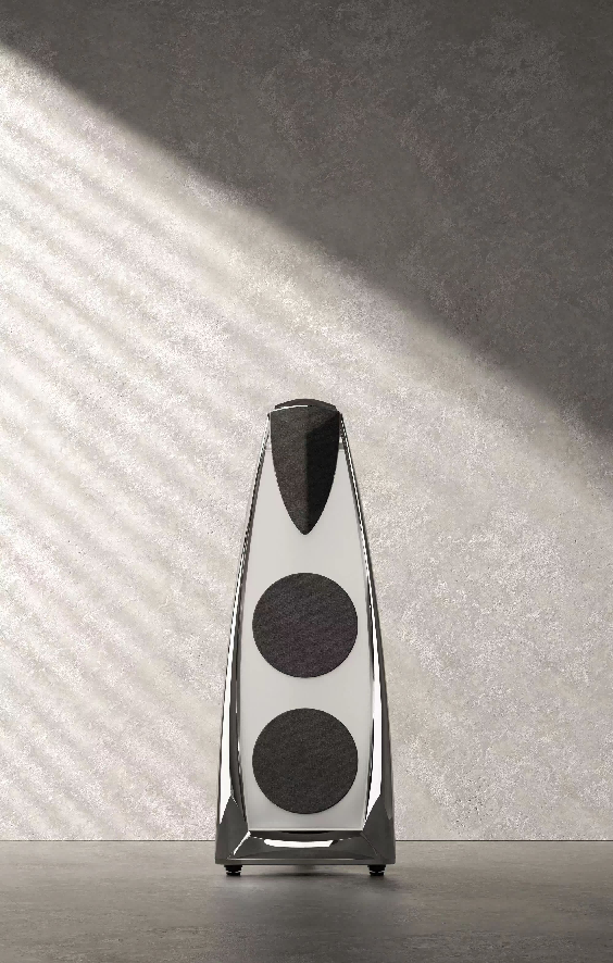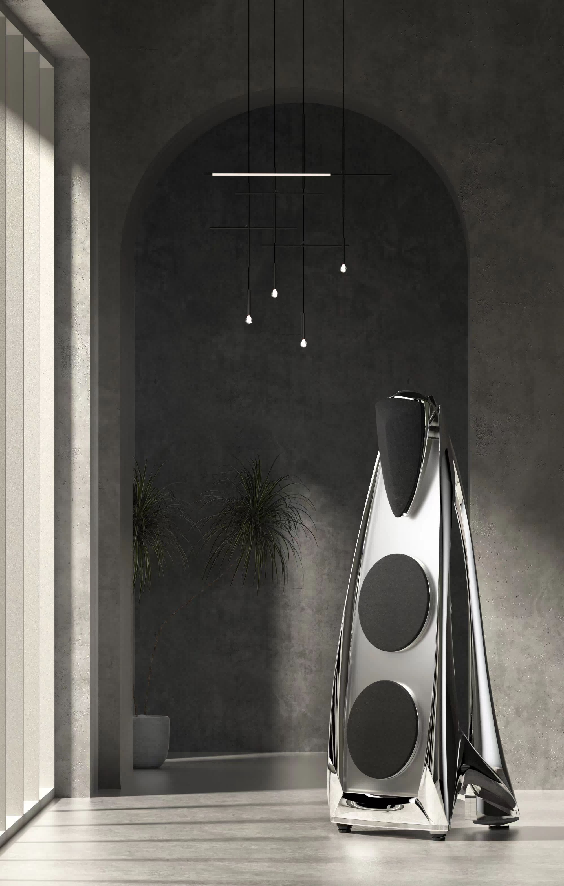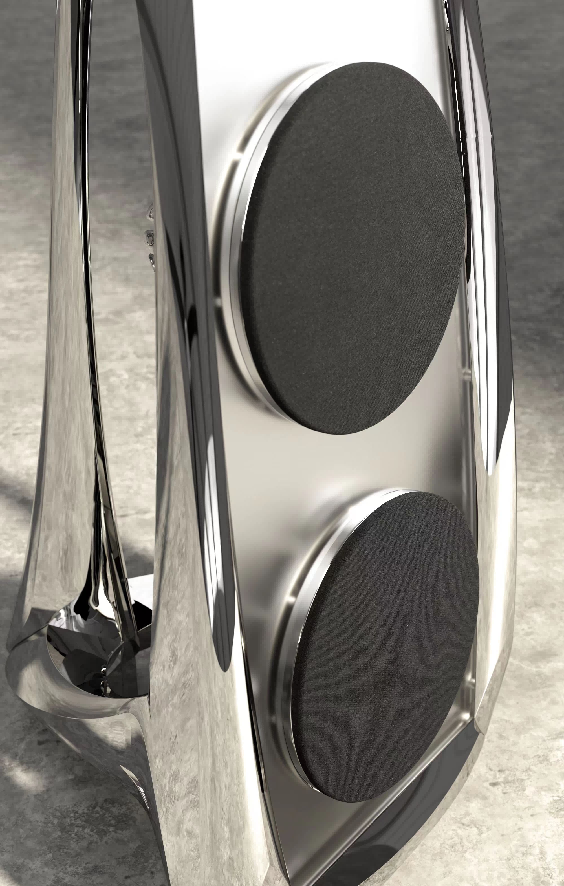 设计师何迪龙于 2012 年在曾老师家中,首次听到此原型样机时,一耳朵感受非常惊艳,声音通透澎湃,高频穿透力极强但不失柔和,中频极线条清晰且光泽感充盈,低频下潜很深且量感十足。声音的第一感受就是美到极致,细品又蕴含深厚的力量。如一位兼备着美的感染力与澎湃气场的歌者在面前颂唱着。与其说设计该产品,更应该说必须用视觉来表达这个声音。