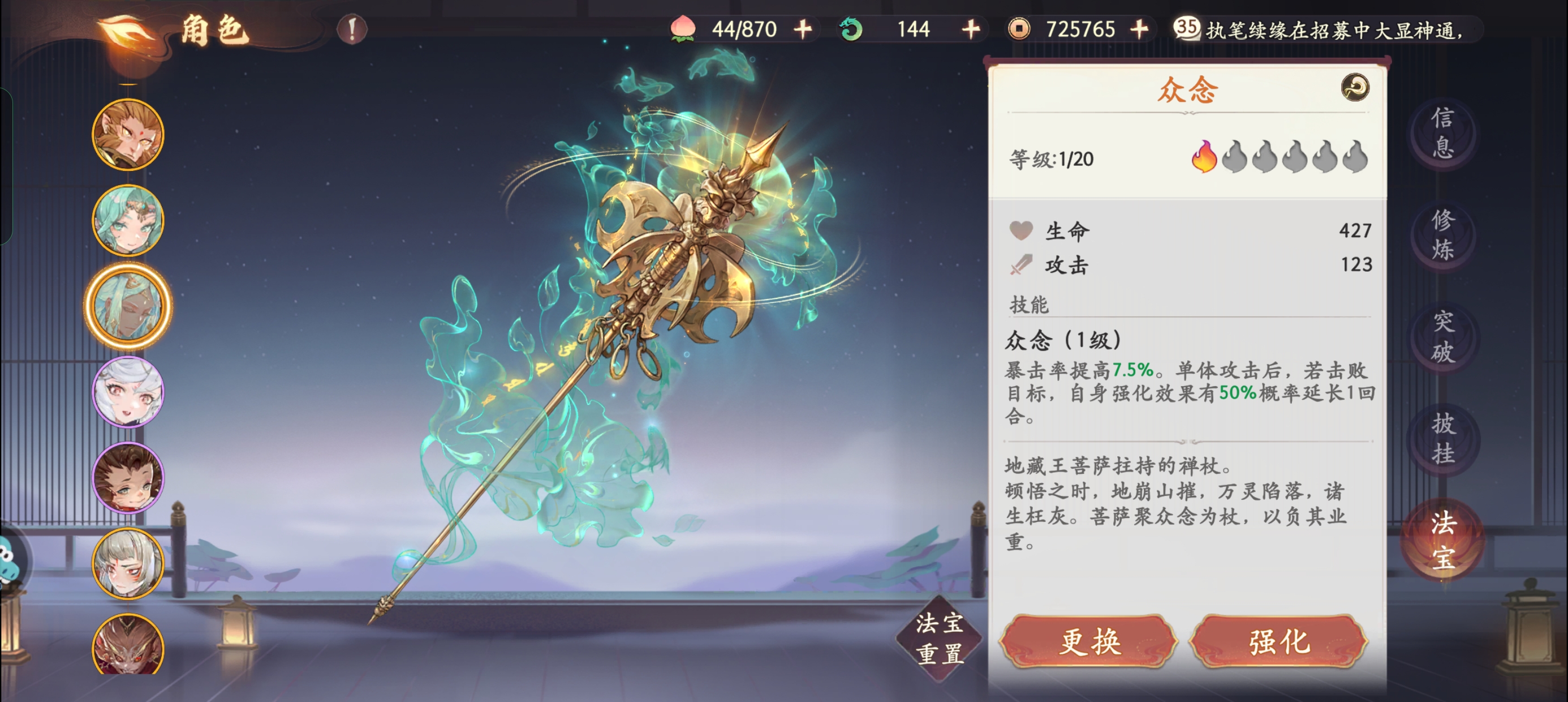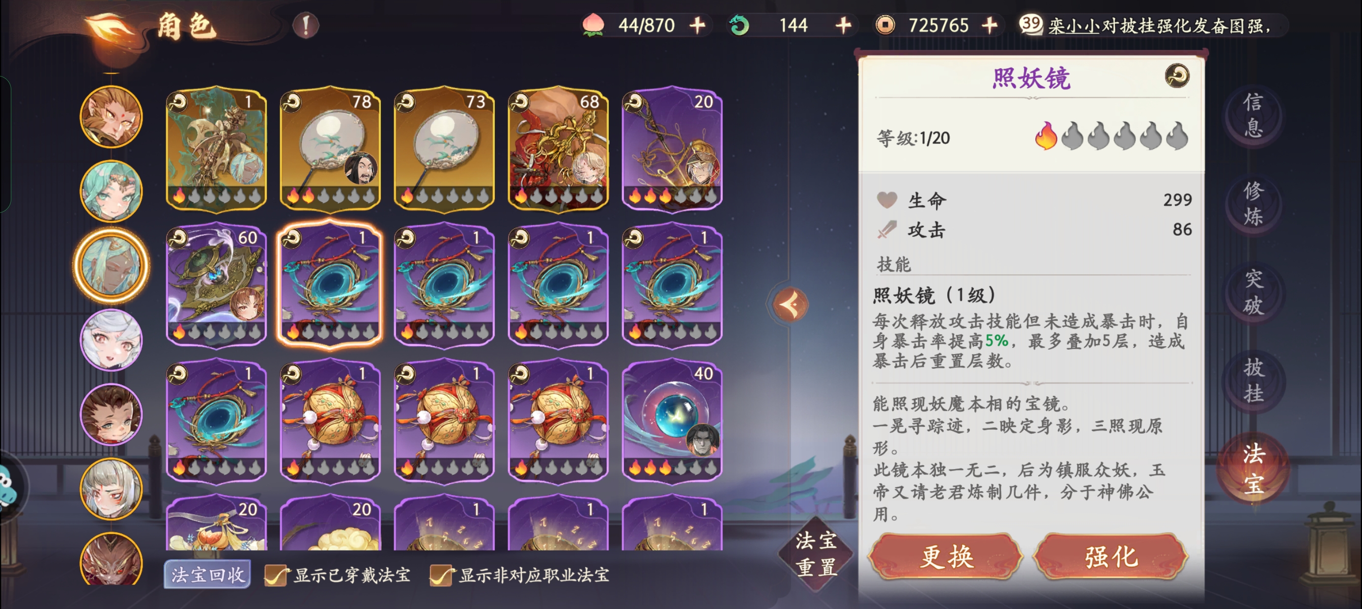 没有众念的情况下,优先选择照妖能够提升暴击率,弥补下暴击率不够的问题。