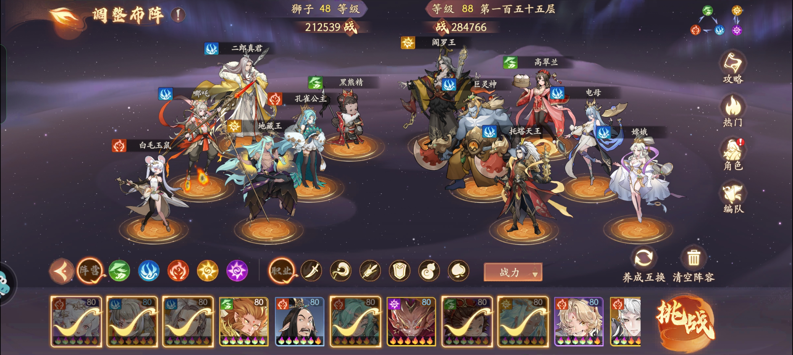 pve:龙王 地藏王 二郎神 老鼠精 孔雀 猴子。 黑熊精和托塔看情况用,如果前排太脆可以多上个肉。 老鼠精放共鸣。 哪吒最少彩一才能用。爬塔看情况调整。一般用日常pve就行,然后根据情况来调整下。 打第一个装备副本和第二个装备副本用羊力大仙。 打黄风怪用昂日星官 pvp补狐狸。