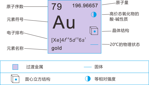 金的元素符号为Au,源于拉丁语中的黄金词语“Aurum”,意思是“灿烂的黎明”。Au位于元素周期表第一副族,原子序数79,相对原子量196.97,密度19.32 g/cm³,硬度2.5~3,熔点1063.69~1069.74℃,沸点2530~2947 ℃(常温常压)。金在地球上的分布并不均匀,90%以上金都分布在了地核里,而地壳中的只有不到1%(丰度仅为0.0011 ppm)。只有位于地壳上部的金才有机会被人类开采,金也因此稀缺而珍贵。