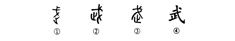 会意字。从止表示行进,从戈表示武器,本义是征伐、示威,非《说文》所说“止戈为武”。甲骨文从止、从戈,或加“行”繁化。金文承袭甲骨文,利簋、盂鼎或增“王”(为周武王之专用字),或从戉(斧钺之属),止旁或讹作“