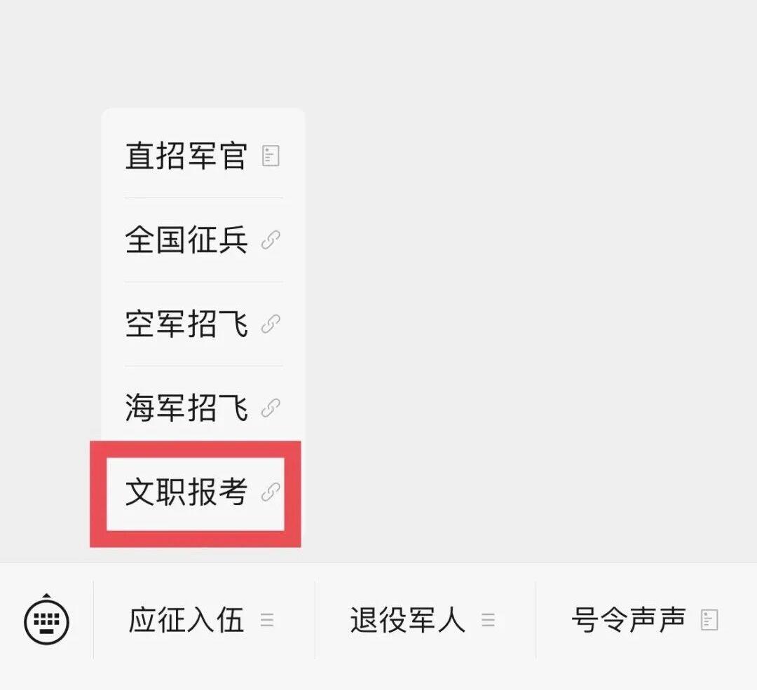 关注“央视军事”微信,点击聊天界面下方“应征入伍”一栏,再点击“文职报考”,可直接进入报名页面。