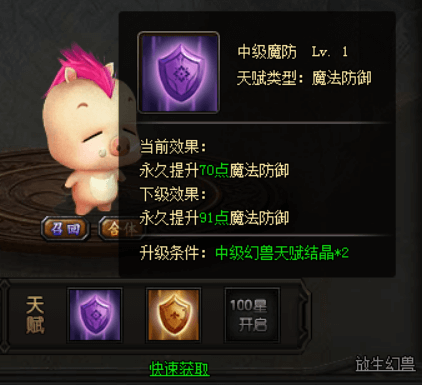 幻兽天赋根据当前幻兽品质及星级来获得,星级越高,开启天赋格就越多。幻兽天赋可升级,升级需消耗对应等级的幻兽天赋结晶