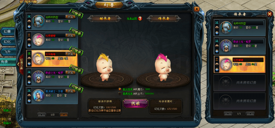 幻兽终身只可传承一次与被传承一次。当您获得了较高品质的新幻兽时,可以选择将老的品质稍差幻兽传承过去,新幻兽将直接继承老幻兽的大部分幻化次数,升星就像搭火箭一样飞快,节省大量的时间成本与副幻兽成本。