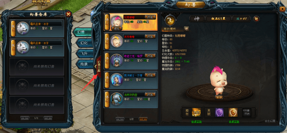 仓库中可直接查看存放幻兽的名字、等级、物理攻击值及魔法攻击值等各种信息。
