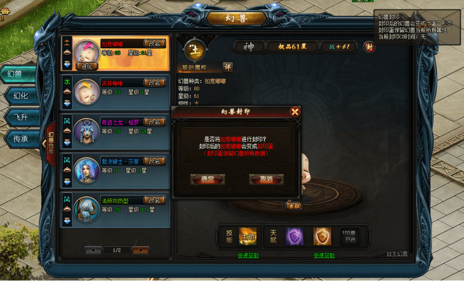 所有幻兽均可封印,幻兽封印后将变为一个封印幻兽蛋存在于人物背包中,