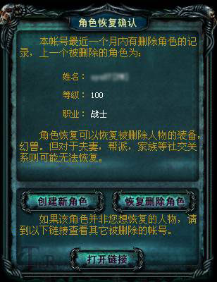 当您登陆游戏,进入创建新人物的步骤之前,系统将自动检测您在该服务器最近一个月内是否有已被删除的人物,如果有,则可以让玩家选择,是进行新人物创建,还是旧人物恢复: