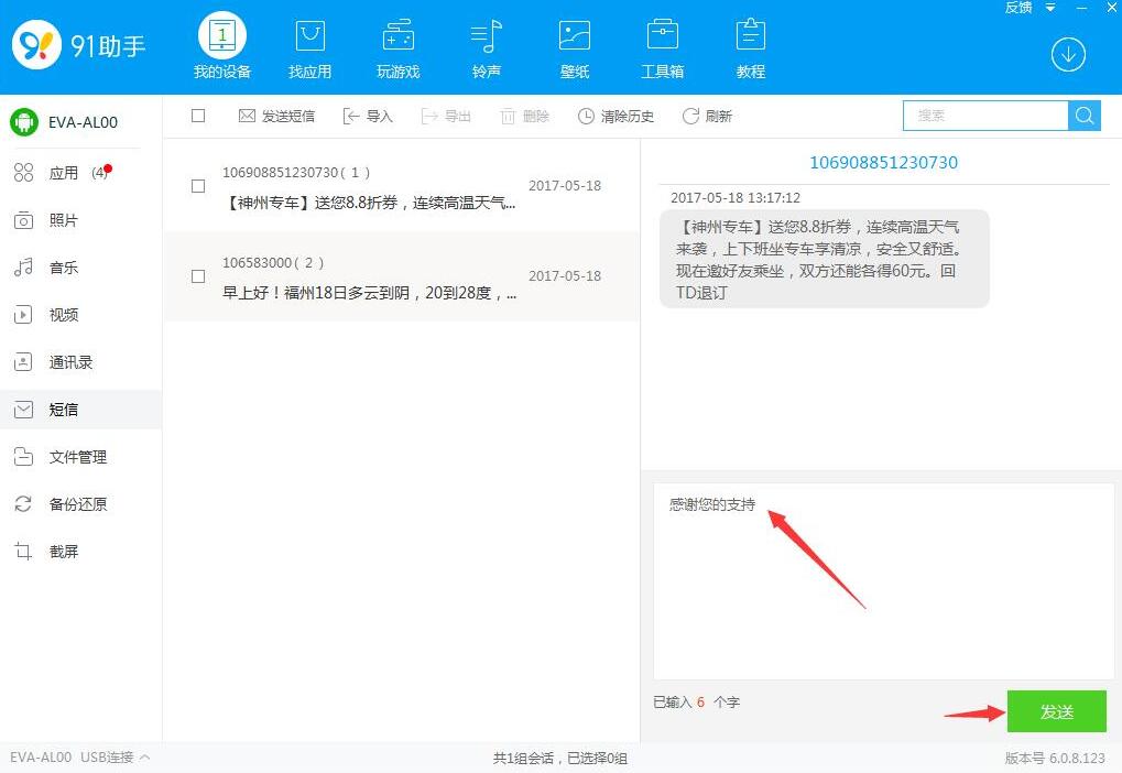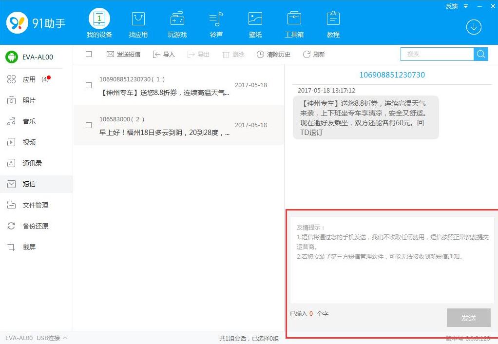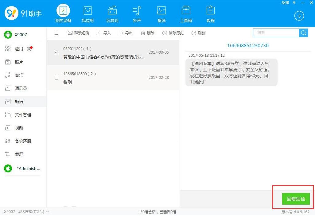 1、连接手机之后,进入91助手官网电脑版软件点击短信。