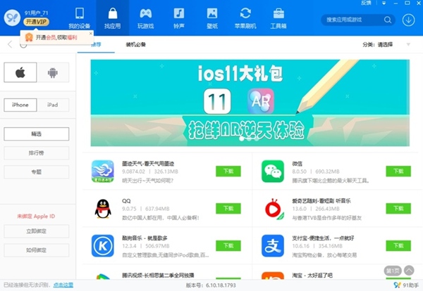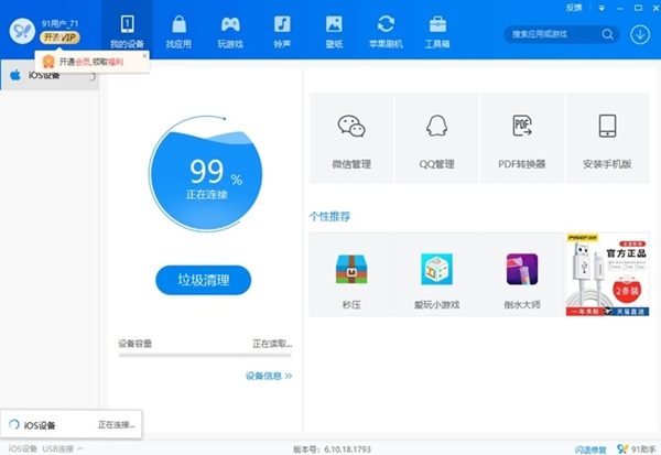 1、打开91助手官网电脑版软件,进入首页后先连接手机;
