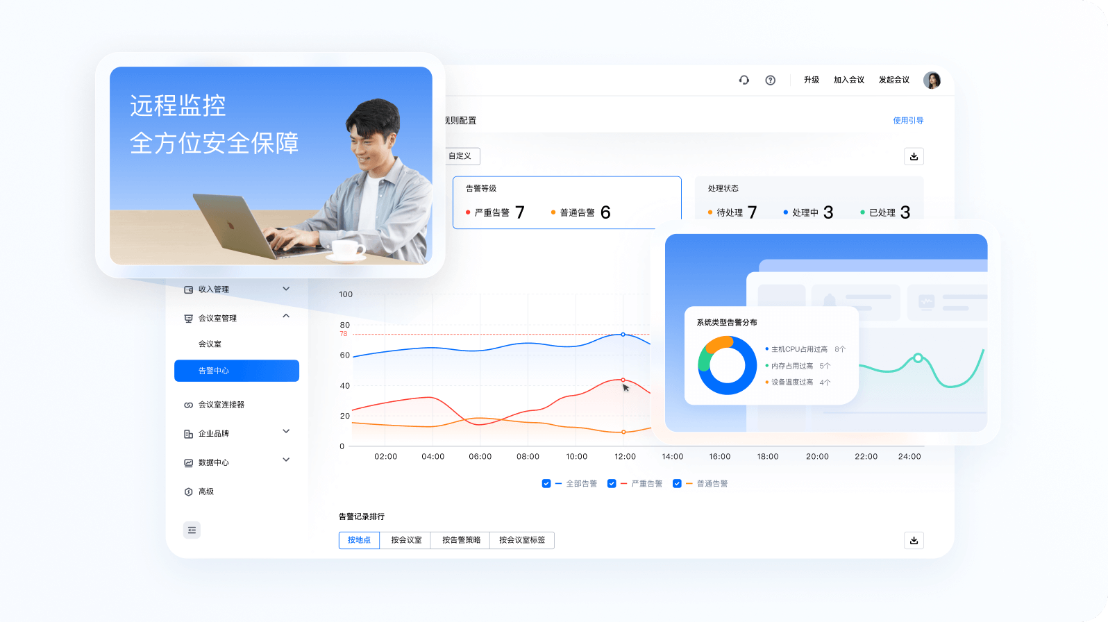 后台支持告警看板、设置与通知,方便管理员远程监控会议室状态