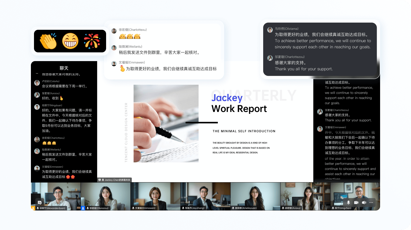 全景显示参会人、互动表情、聊天和实时字幕,畅享沉浸式协作