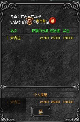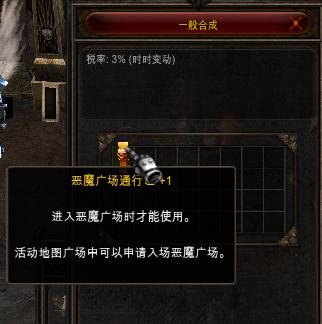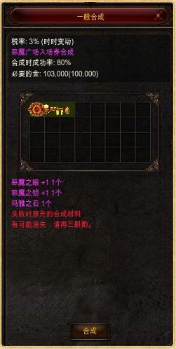 2、「恶魔广场通行证」需利用「恶魔之眼」与「恶魔之钥」两种合成材料道具及玛雅之石,跟魔域类似的网络游戏通过玛雅哥布林进行合成。(合成时只有相同等级的材料才能进行合成)。