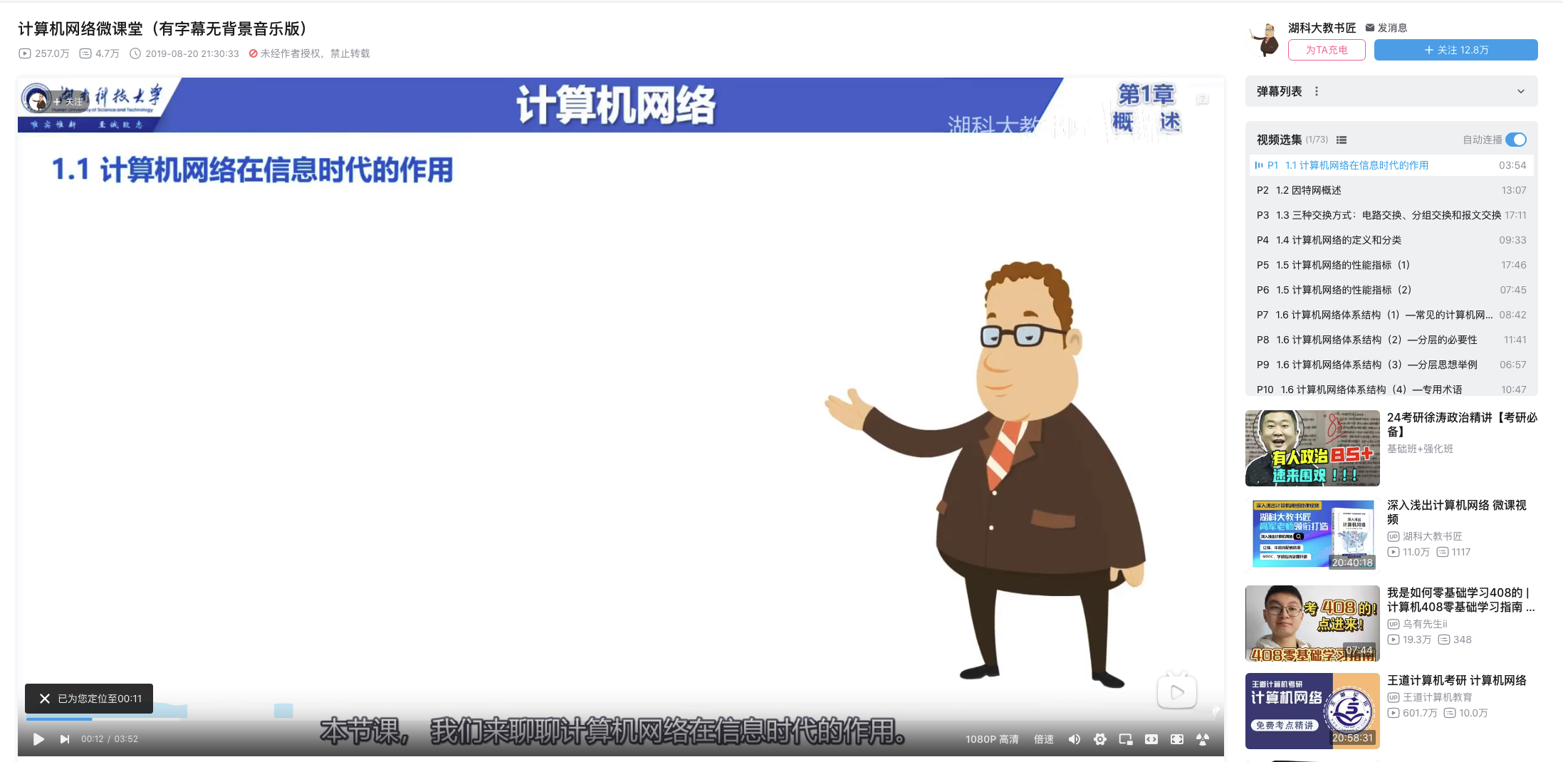 这个 UP 主讲的计算机网络十分通俗易懂,并且还有一些实验,还有考研 408 相关的题目讲解,适合考研党和找工作面试的同学。