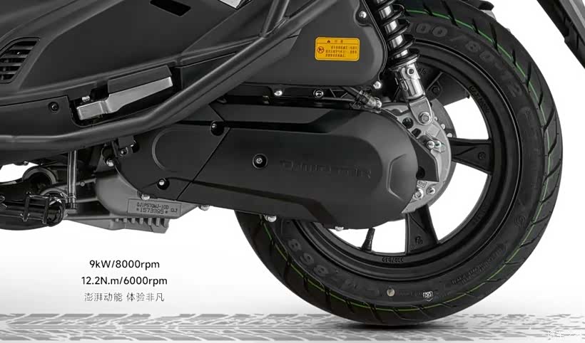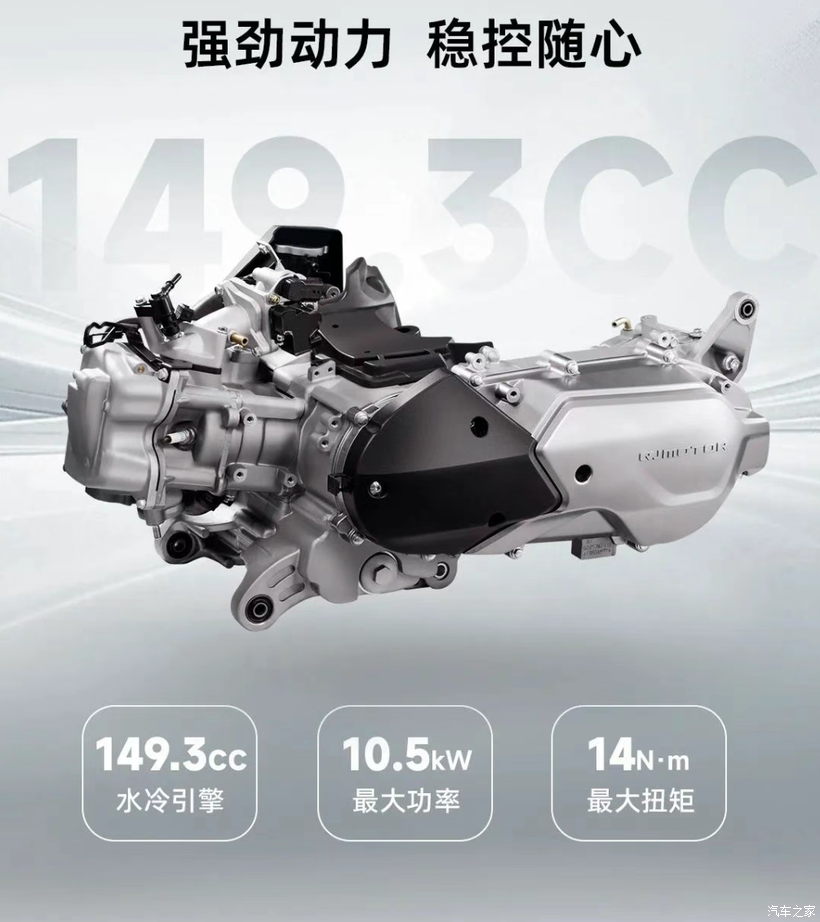 钱江FLY150使用了一台单缸水冷2气门SOHC发动机,实际排量149.3cc,能输出10.5kW/8500rpm的最大功率,而最大扭矩方面则是14N.m/6500rpm,在水冷系统与10.6:1高压缩比的配合下,也让钱江FLY150的发动机动力数据成功跻身国内第一梯队。