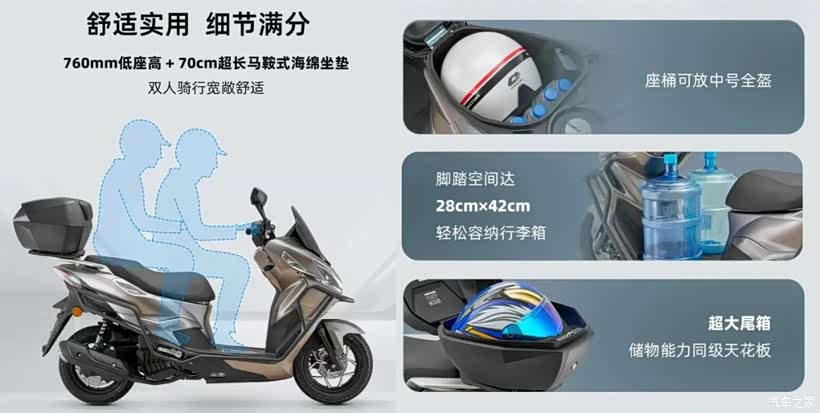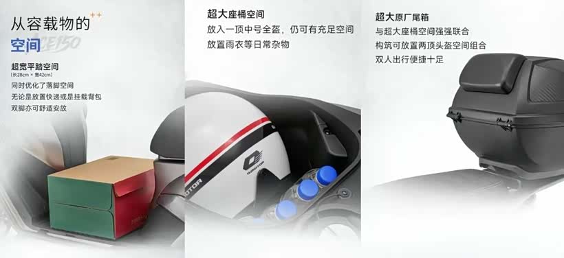 另外FLY150的平踏脚部空间较大,拥有28X42mm的长宽比,这个空间之下,日常驾驶中甚至可以放下1件饮用水,或者一个20寸的行李箱。同时杠箱版本还提供了超大容量尾箱,能轻松实现双盔储物组合, 双人出行装备一车搞定。