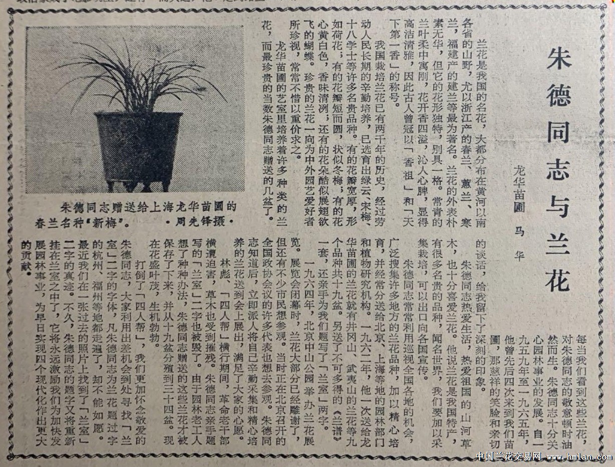1955年已年届七旬的朱老总国事没有之前繁忙,便在中南海建起兰棚,重拾起间断20年的兰花。之后每到兰花产地一有空闲便亲自登山采集,在朱老总鼓励下,产地公园纷纷开设兰园。朱老总采到满意兰花,便将其大量扩种,分送全国各地兰园。为提高育兰技能,朱老总还将兰花相关的书籍油印分发到各个兰园。