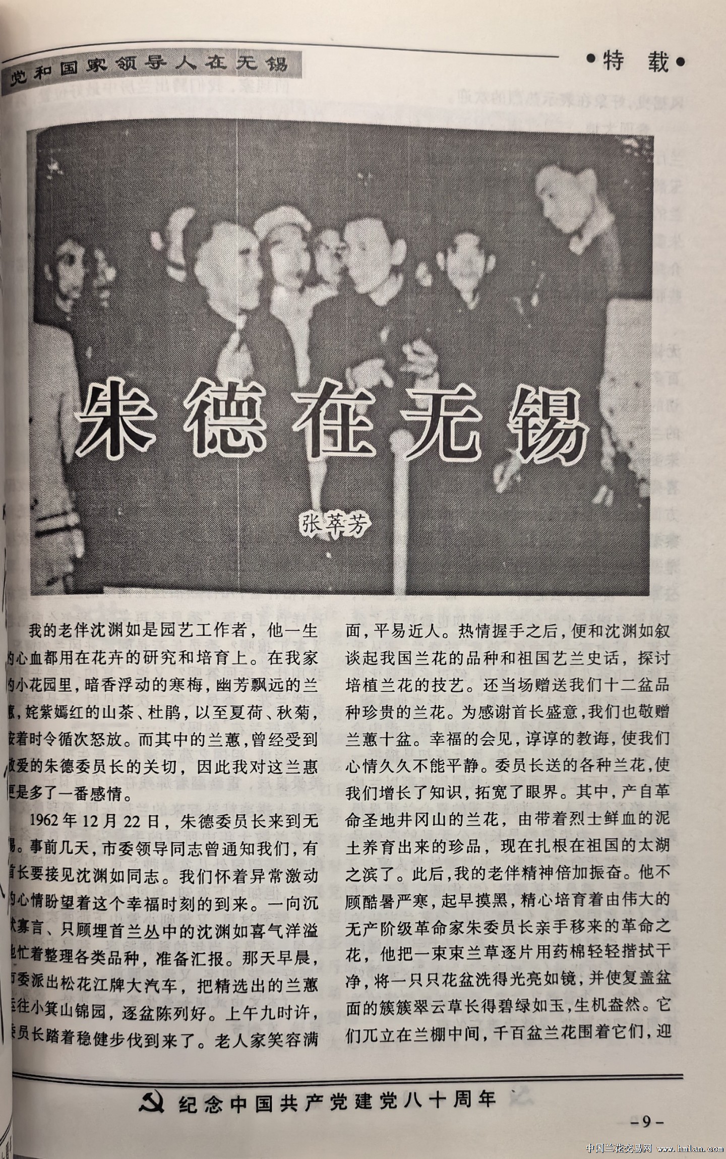 在无锡两次会见沈渊如时,朱老总总是聊起云南、四川大山中的红花红舌,引得“江南兰王”也心驰神往。二人互赠22盆兰花,沈渊如将自己精心培育的一盆春兰素心,命名“德素”相送。 沈渊如所送兰花后来全部进入北京中山公园,时常见展出。