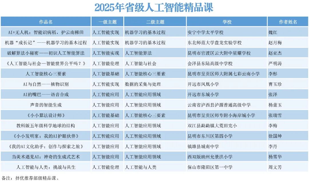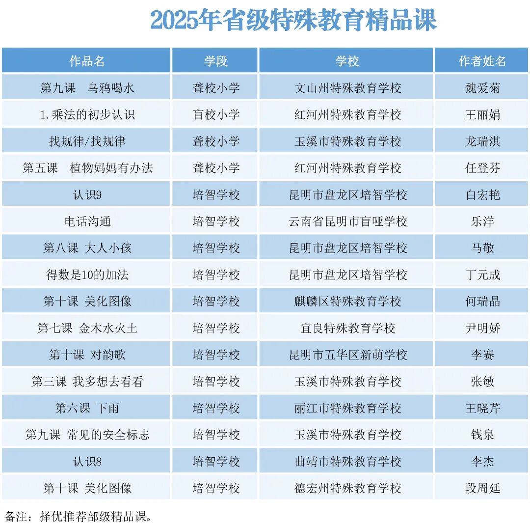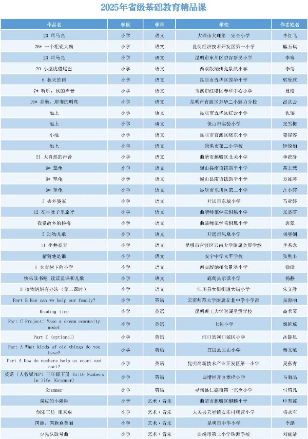 根据云南省教育厅发布的2025年“基础教育精品课”遴选工作安排,经州市推荐、省级专家评审等环节,最终确定345节课程为2025年省级精品课,并于2025年11月21日起进行公示。
