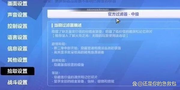 3、点击进入到拾取页面后,然后下拉右侧内容,在里面找到一个物品过滤设置,这时候就需要玩家将它修改成为我们想要的装备等级了,有初级、中级、高级等。