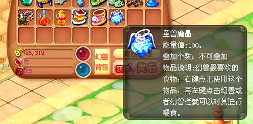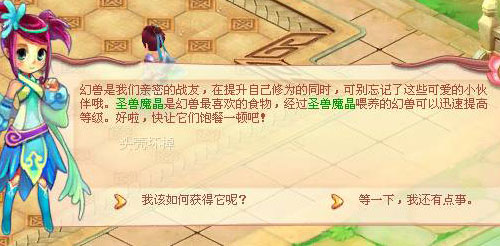 打开你的随身物品栏使用“圣兽魔晶”后,可以随时喂给符合上述条件的幻兽宝宝哦!(右键点击使用“圣兽魔晶”,而后再点击画面中需要喂食的幻兽宝宝就可以了),幻兽食用“圣兽魔晶”后会通过有不同的对白表达它的感激之情,你能够看到几种呢?