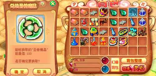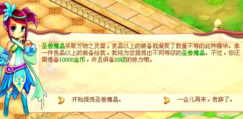 首先把装备交给仙隐村的圣兽魔晶提炼师(350,223),她会先提示你该装备能够转化为蕴含多少能量的圣兽魔晶。点击“确定”进行提炼后,她会收取你随身携带的10000金币作为手续费,并同时将提炼好后的“圣兽魔晶”放到你的随身物品栏中。