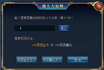 军团长还可以消耗军团金币或者军团魔石对图腾柱进行战斗力加持,提高图腾战斗力,以提高可分享的军团战斗力。每根图腾战斗力加持最高不超过8点,每根图腾柱的加持时间为30天。