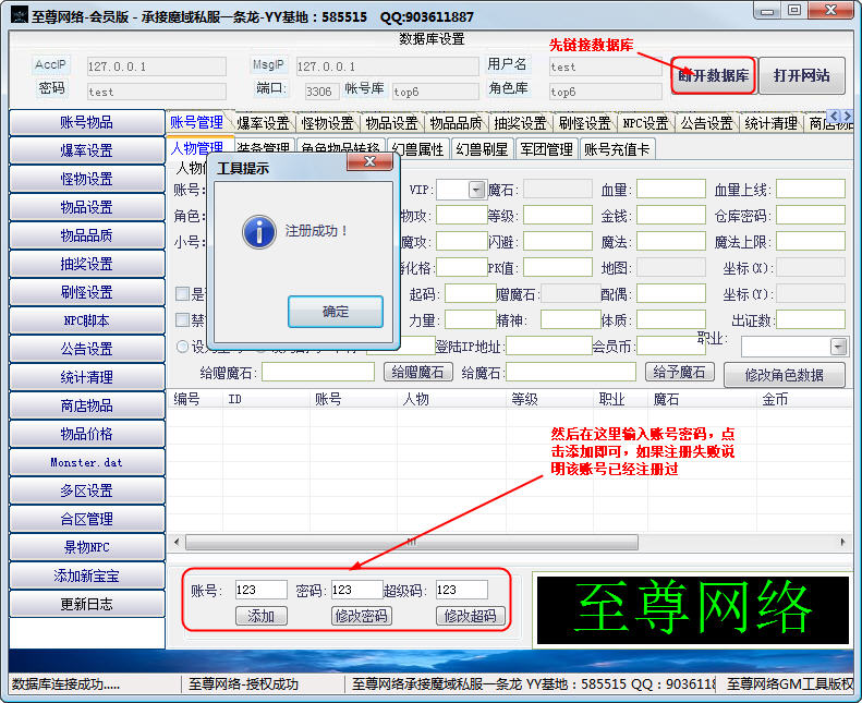 第七步:点击右上角的链接数据库,然后在正下方注册账号。玩家以后可以在这个工具里面来更改游戏的各种内容,自己当GM。