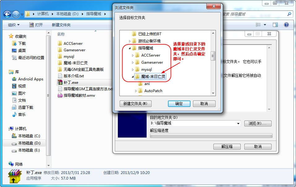 第八步:账号注册完毕后,点击游戏目录下的补丁,然后选择魔域客户端文件夹,点击确定。