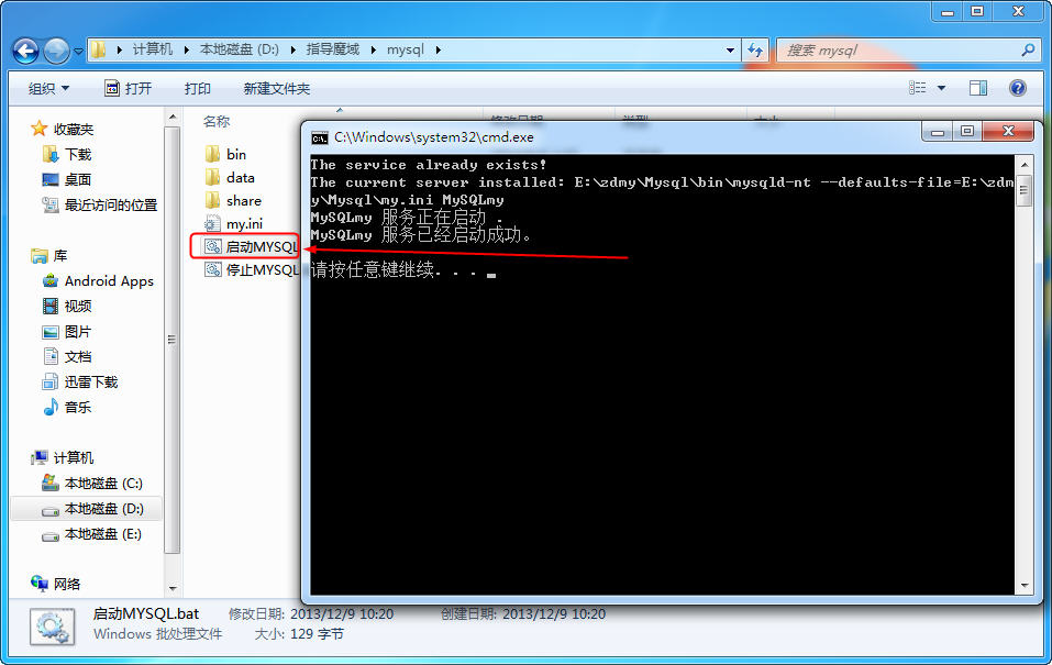 第二步:点击mysql目录下的启动MYSQL,如果路径错误则会导致启动失败。