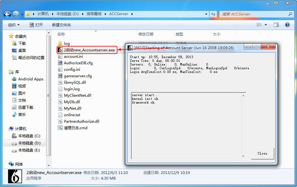 第三步:启动成功后,点击ACCServer目录下的2启动new_Accountserver.exe,出现framework ok即为成功。