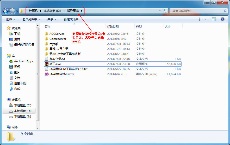 第一步:因为游戏需要启动数据库,而且对于游戏路径有着严格的要求,所以请玩家务必将游戏解压到D盘根目录,如下图所示。